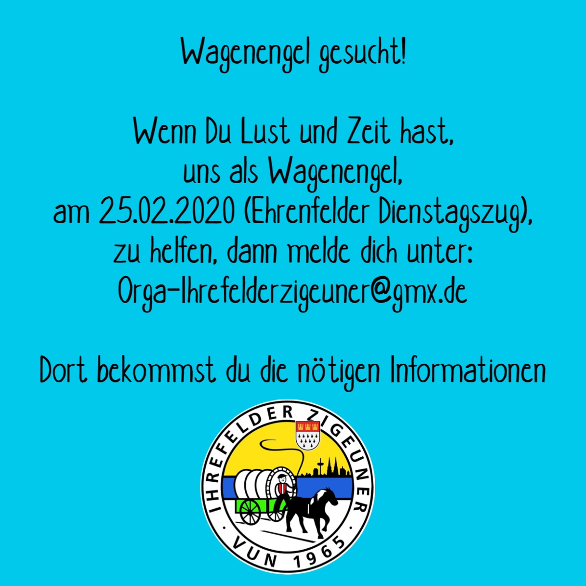 Wir suchen für den Ehrenfelder Dienstagszug, am 25.Februar 2020, Wagenengel. Wenn du zeit, lust und mind. 18 Jahre alt bist, dann meld dich unter: Orga-Ihrefelderzigeuner@gmx.de dort erhälst du alle nötigen Informationen!